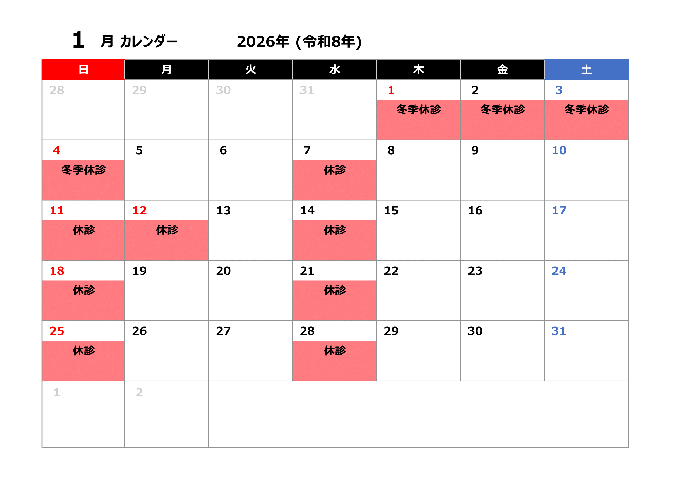 1月は日曜日、水曜日、12日(成人の日)が休診となります。
