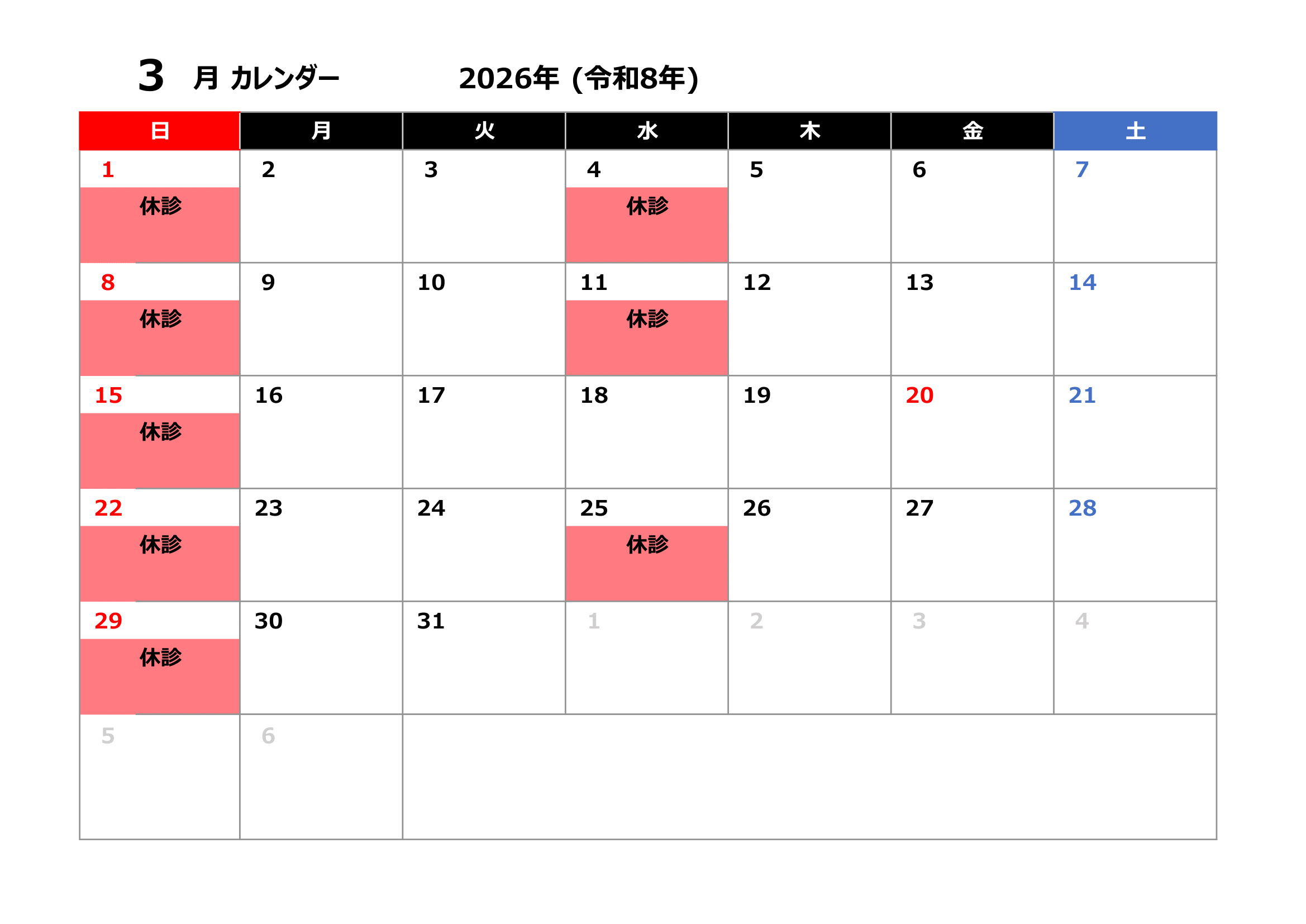 3月は日曜日、水曜日、20日(春分の日)が休診となります。