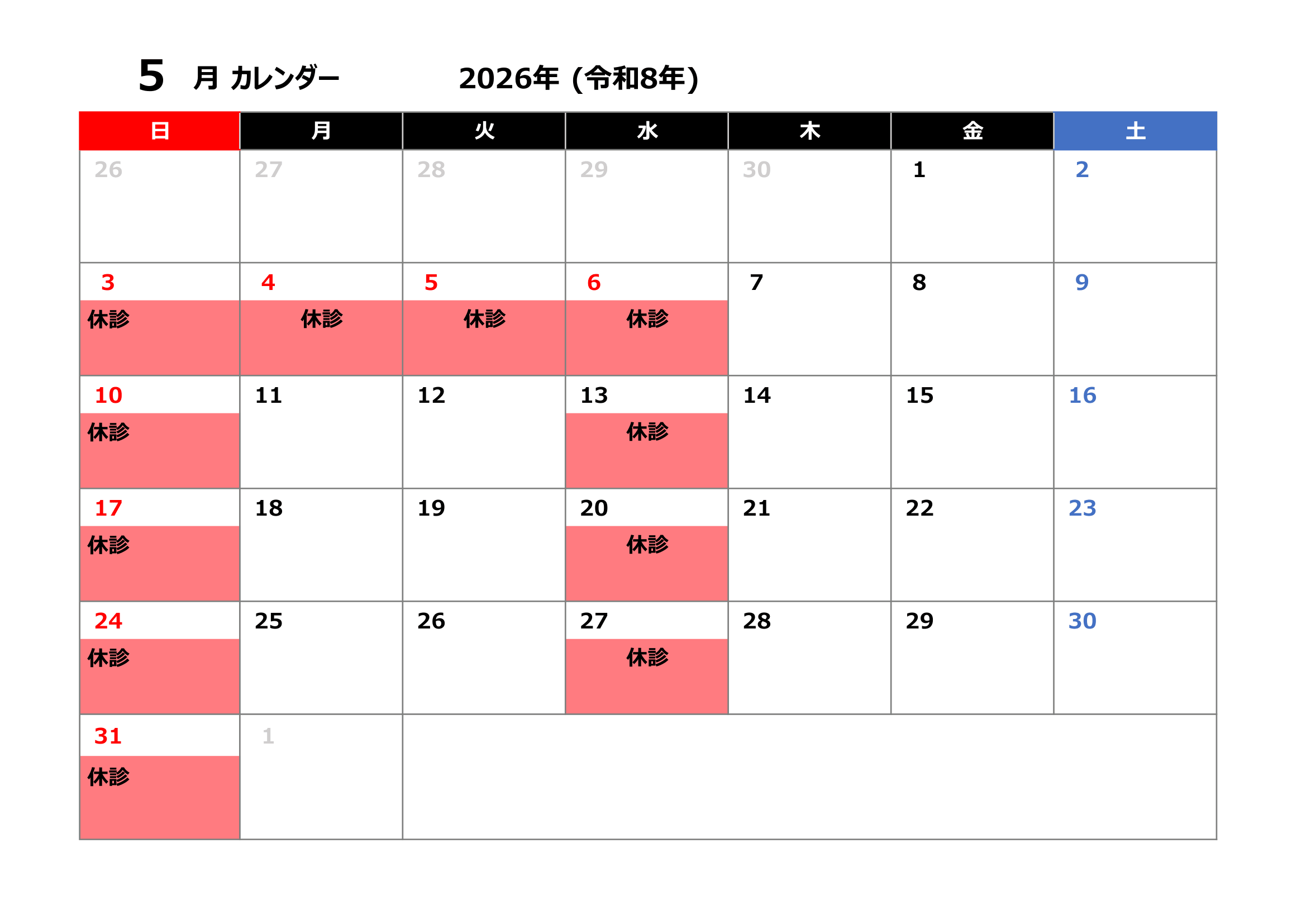 5月は日曜日、水曜日、およびGWとして3日(日)から6日(水)が休診となります。